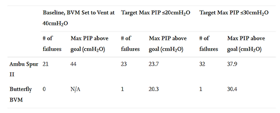 "The Butterfly BVM exceeded the Ambu Spur II in delivering appropriate Vts and in keeping PIPs below target maximums to simulated adult and pediatric patients...."